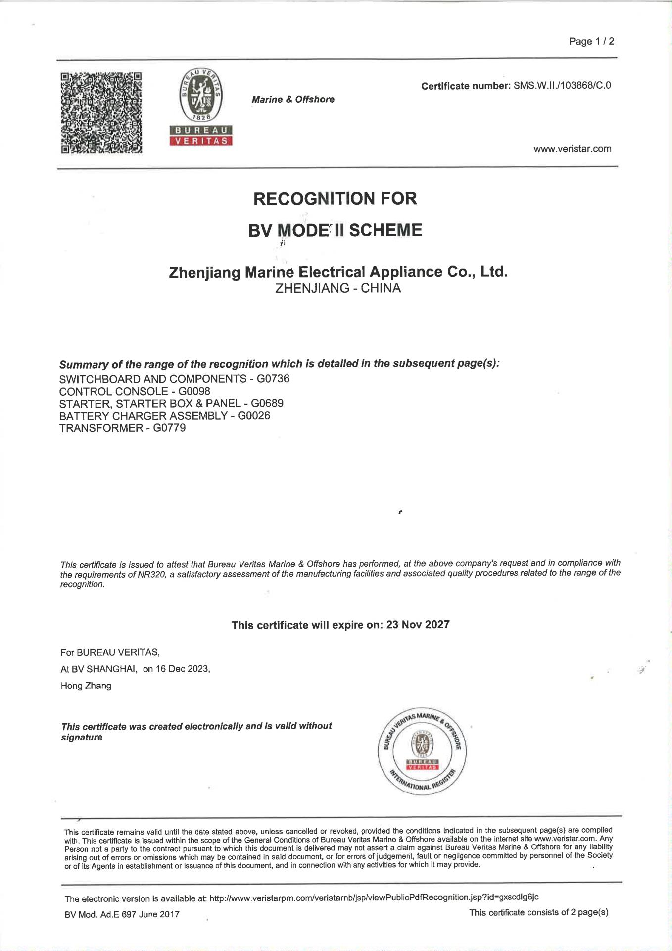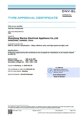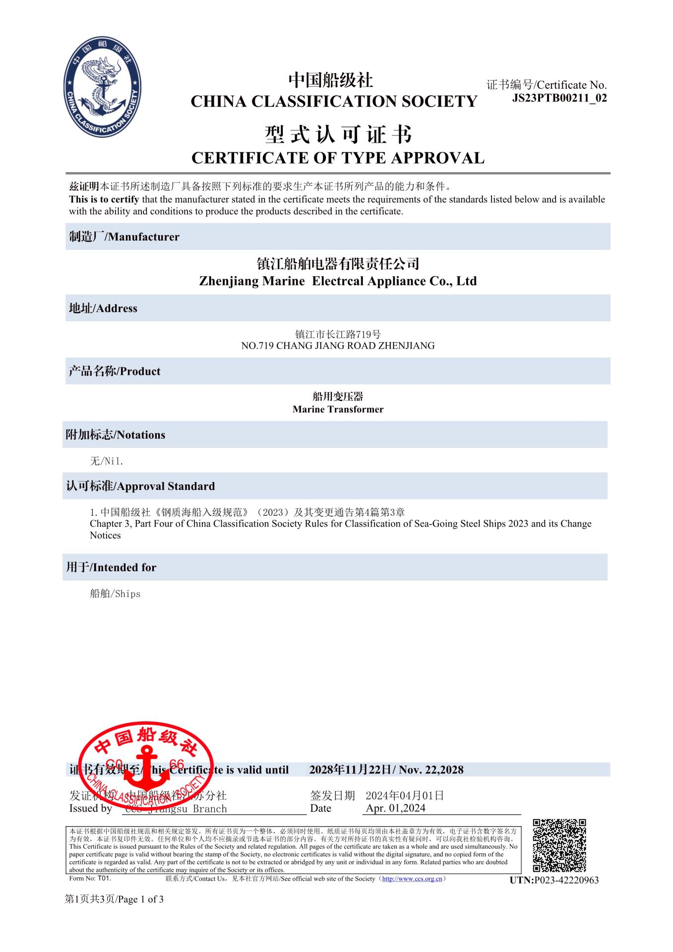 中压岸电连接器(船用插座、船用插头)型式认可证书