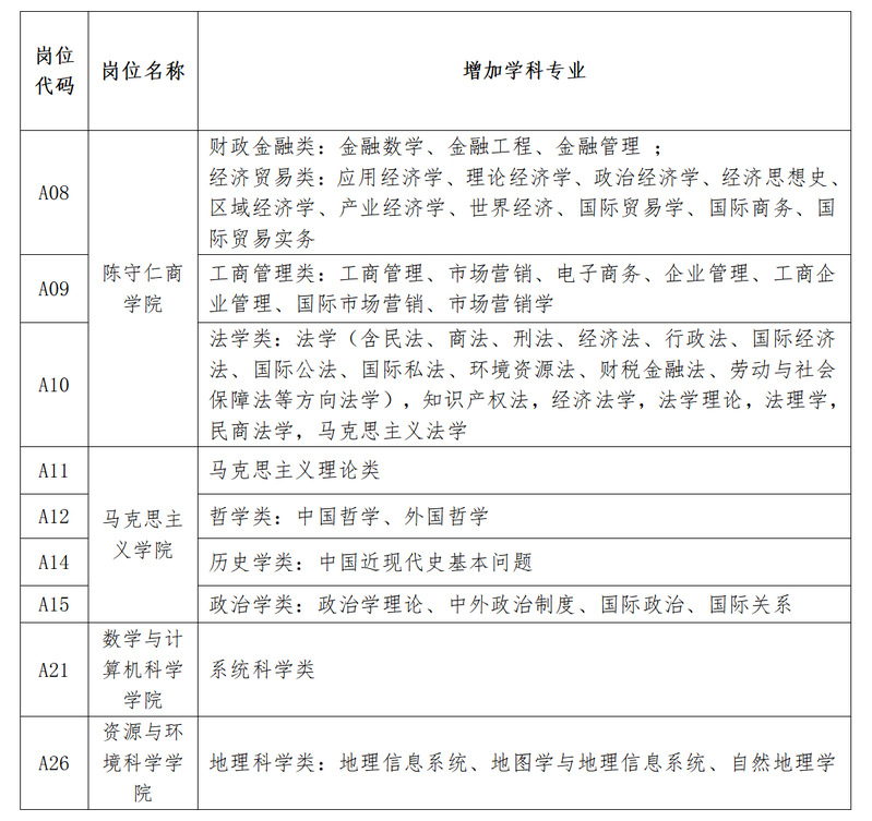 2023年泉州腾博官网诚信为本专业服务公开招聘高层次人才方案》于2023年4月6日在福建省人力资源和社会保障厅网站、泉州腾博官网诚信为本专业服务教师工作部(人事处)网站公开发布。方案里A08、A09、A10、A11、A12、A14、A15、A21、A26岗位需求专业增补如下: