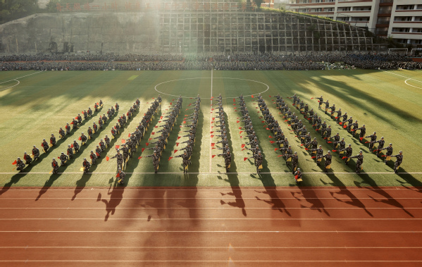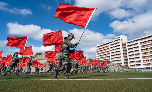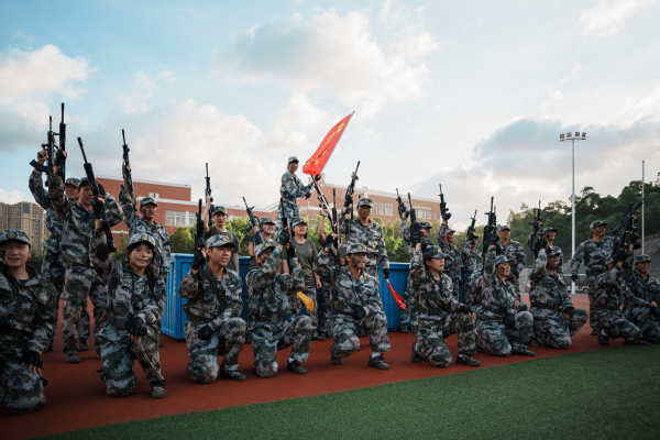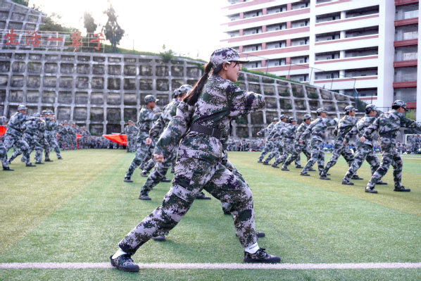 伴随雄壮的国歌声,军训会操拉开序幕。各方队依次列队,脚踢正步,有序入场;匕首操、旗语操、刺杀操、军体拳、舞旗、战术方阵军事科目汇演依次展开,检验此次军训取得的良好成果,充分展示了学子们昂扬向上的精神风貌。